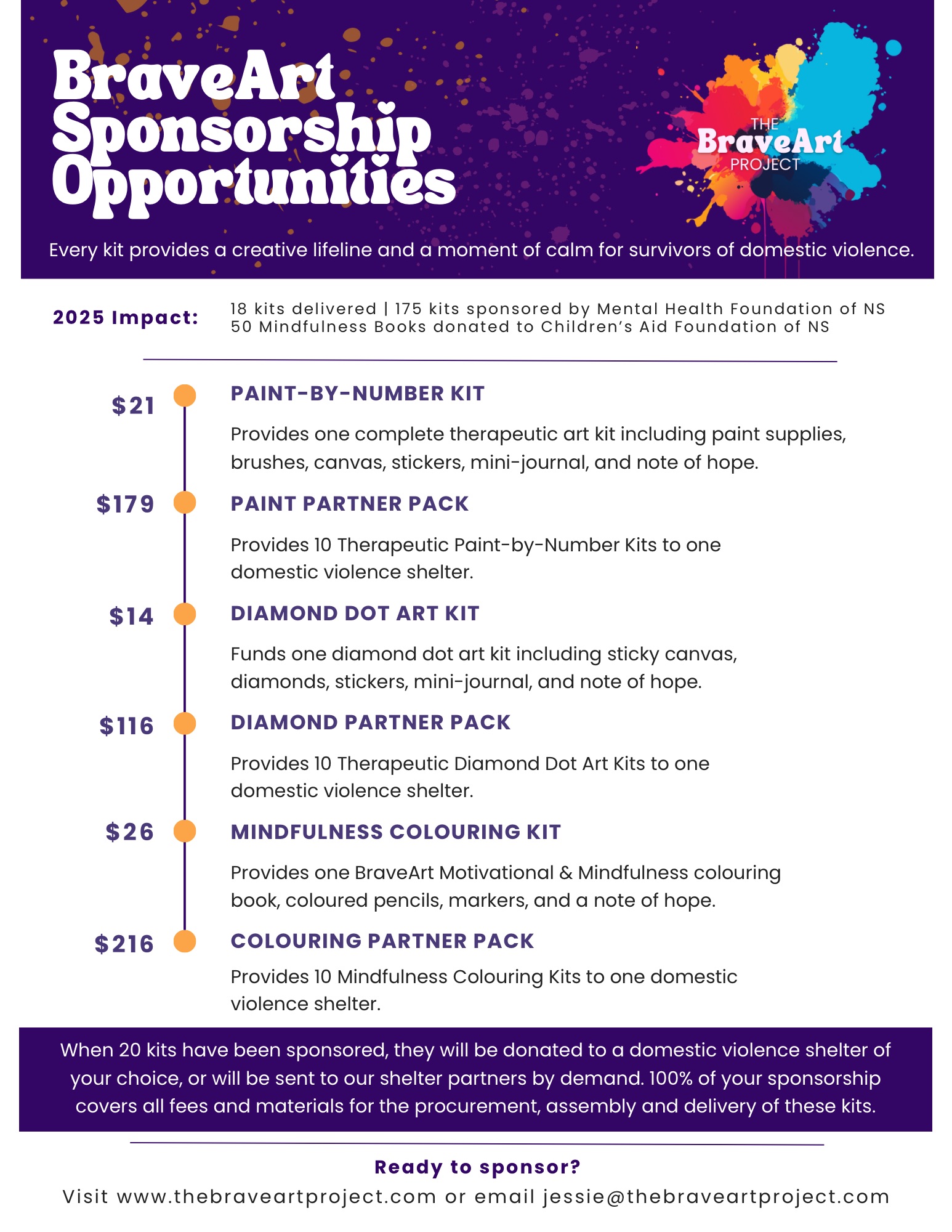 When you sponsor a BraveArt Kit, you’re not just giving supplies, you’re giving hope, courage, and a creative lifeline to someone rebuilding their life.